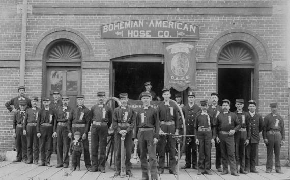 This photograph is of the Bohemian-American Hose Company, a fire brigade staffed by Czech-Americans of Cedar Rapids. The Company was located at the rear side of the CSPS (Czechoslovak Protective Society) Hall, which is now home to Legion Arts and other local businesses in the New Bohemia (NewBo) district of Cedar Rapids. The Company consisted of 29 volunteer firefighters who provided services to the community until the formation of a paid fire department in 1894. For any use other than instructional resources, please check with the organization that owns this item regarding copyright restrictions.