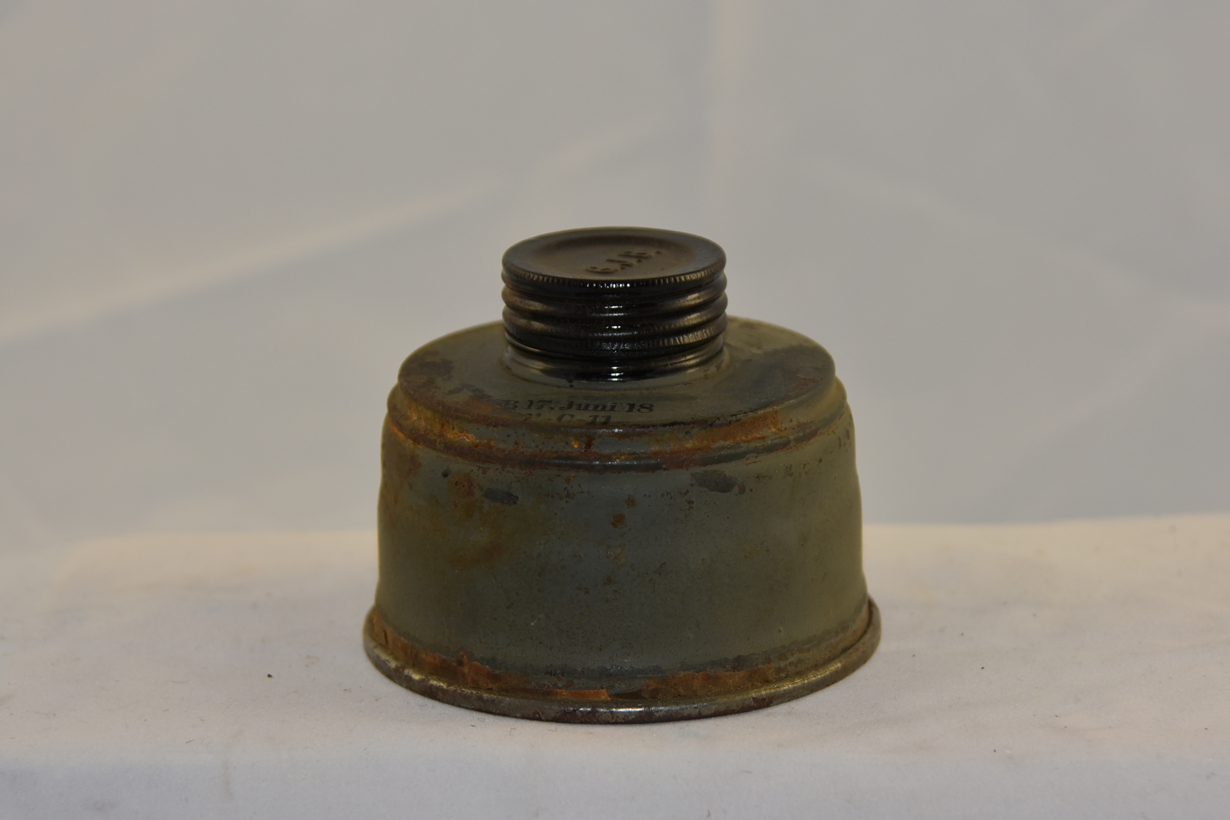 This is the filter container for a Lederschutzmaske-type gas mask from the First World War. It is a round, cylindrical canister with a hinged lid and cloth carrying strap. The top surface of the lid reads, "Mathes 12/111," indicating the battalion and regiment that this item's owner belonged to. On the inside of the lid is a faded maker's label, which is now illegible. On the bottom of the canister is a printed disk of paper detailing (in German) the instructions for how to properly use and clean the filters provided. The edges of this paper disk are discolored, making exact translation difficult. In comparison to American gas masks of the same time period, German Lederschutzmaske used can-shaped filters that attached directly to the face of the mask itself, rather than to a tube. This canister would have carried such filters. There is considerable rust and other patina on the exterior and interior surfaces of this object, as is to be expected due to its age and probable use. This content can be used with the following resources: SS.4.25: Technological Change This content can be used to educate students on the advancements that were made to military protective equipment during the First World War and how those advancements impacted the service of Iowan soldiers. For any use other than instructional resources, please check with the organization that owns this item for any copyright restrictions.