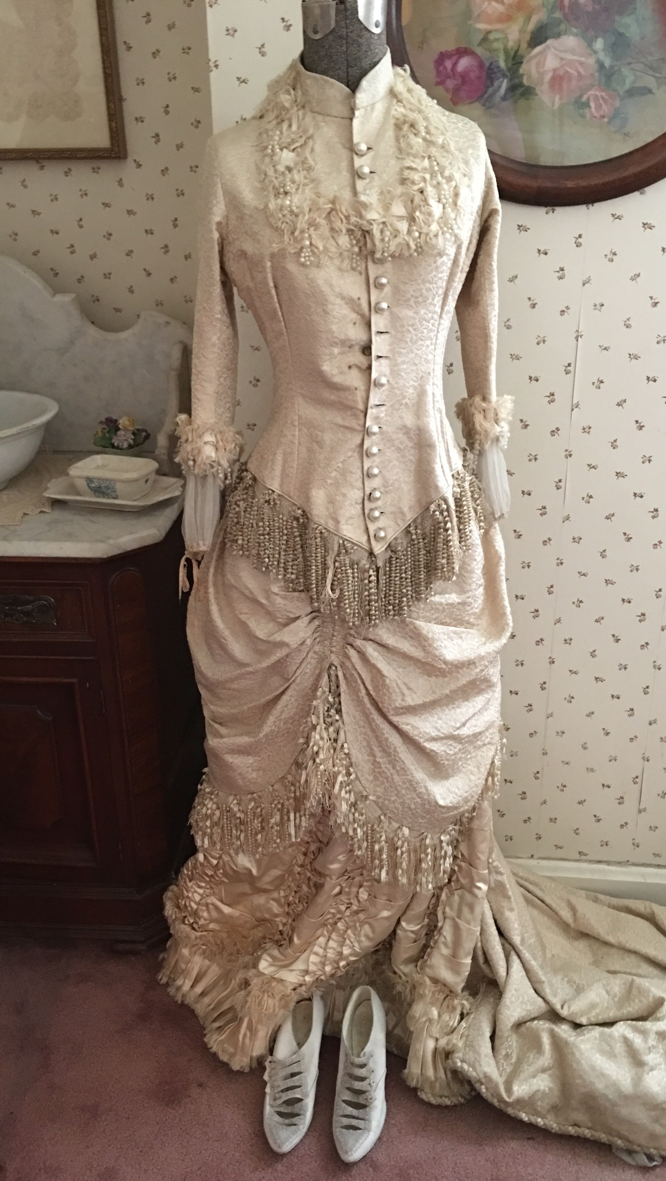 Dress/Gown owned and worn by Sara Sherman, wife of Hoyt Sherman. Content can be used with the following standards: SS 3. 28 Cultural Contributions and SS 9-12.24 Iowans Influence Iowa Environment. Accessions of photos of the Sherman house (exterior) and dining hall (under Relations) can be included with gown to form a lesson about upper class culture in the Victorian era and how it varied with lower class. For any use other than instructional resources, please check with the organization that owns this item regarding copyright restrictions.