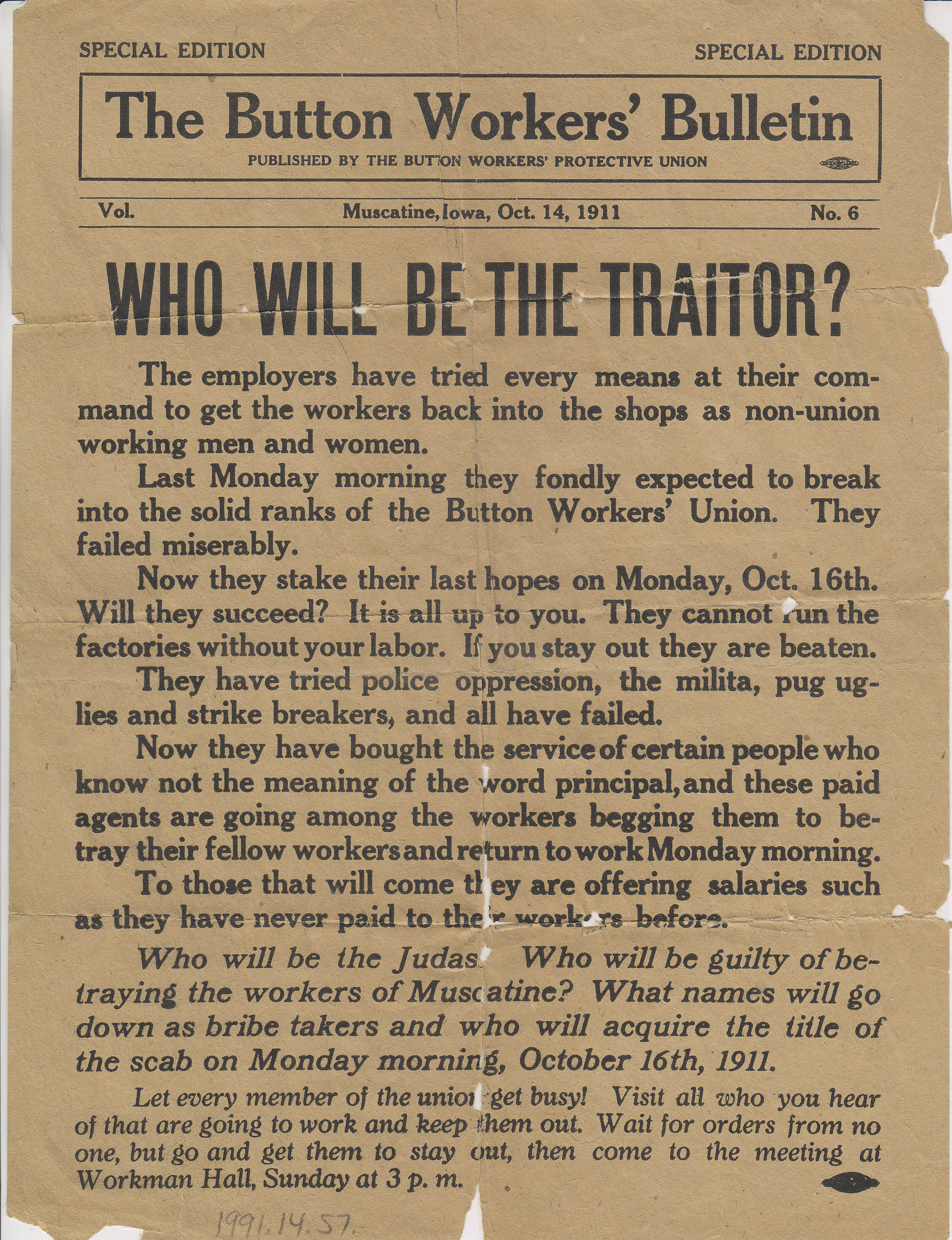 This bulletin was created by the Button Workers' Protective Union in October, 1911. The bulletin encourages workers to remain on strike and to not give into pressure from their employers. It also says that those who would return to work were traitors. During July of 1899, disagreements rose over the costs of tools and wages paid to employees. Between 1899 and 1900, nine strikes took place. Eventually the Button Workers' Protective Union was formed in November, 1910. The Union helped organize a large strike in February of 1911 following the closure of 43 sites. They blame overproduction as a reason and organized picket lines outside the factories. A total of 2,300 protesters went on strike and during the following months, the strike gained national attention. Muscatine police along with hired police from Chicago and St. Louis worked with the union to sign a peace agreement in May of 1911. The strike officially ended in in the spring of 1912. Content can be used with the following standards: 2nd grade SS 2.24 Natural Resources, SS-W.H. 9-12.26 Iowans Influence World History and 4th grade SS 4.25 Technological Changes in a lesson on how the natural resources of Iowa led to businesses and the working class struggles of the early 1900s. For any use other than instructional resources, please check with the organization that owns this item regarding copyright restrictions.
