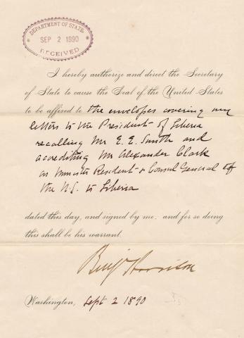 This document, signed by President Benjamin Harrison, appointed Alexander Clark as the ambassador to Liberia. Alexander Clark was born free in Pennsylvania in 1826 and moved to Muscatine, Iowa, at the age of 16 to work as a barber. Once settled, he opened a business selling firewood to Mississippi River steamboats and thereby amassed considerable wealth. He also became an entrepreneur in local real estate. During the second half of the 19th Century, Clark was active in Republican politics and was called "the Colored Orator of the West" for his speeches on the right of suffrage. In 1868, Clark was appointed chairman of a "colored mans" committee to rewrite the Iowa State constitution, eliminating the word "white" from the document, and thereby granting political equality to Iowans two years before the ratification of the Fifteenth Amendment to the United States Constitution. Clark is notable in Iowa history for other things, too. He sued the Muscatine school board on behalf of his daughter, Susan, in a landmark case that outlawed school segregation in Iowa. His son, Alexander Jr., became the first black graduate of the University of Iowa law school in 1879. Alexander Sr. became the second black graduate of the law school in 1884 at the age of 58. In 1890, President Benjamin Harrison offered Clark the opportunity to become the first United States ambassador to the nation of Liberia at an annual salary of $4,000. Clark died of fever in Liberia in 1891. Content can be used with the following standards: 3rd grade SS 3.28 Cultural Contributions, 5th grade SS 5.26 Civil Rights, 8th grade SS 8.25 Iowa Governments, SS-Gov.9-12.28 Iowa Issues and Policy and SS-U.S. 9-12.23 Iowans Influence U.S. History. Lessons can be formed on Clarks' contribution to fighting for civil rights change in Iowa and the legislation changes regarding African-Americans during the late 1800s after the Civil War. Photographs of the original document are attached. A transcript of the document is also attached. For any use other than instructional resources, please check with the organization that owns this item regarding copyright restrictions.