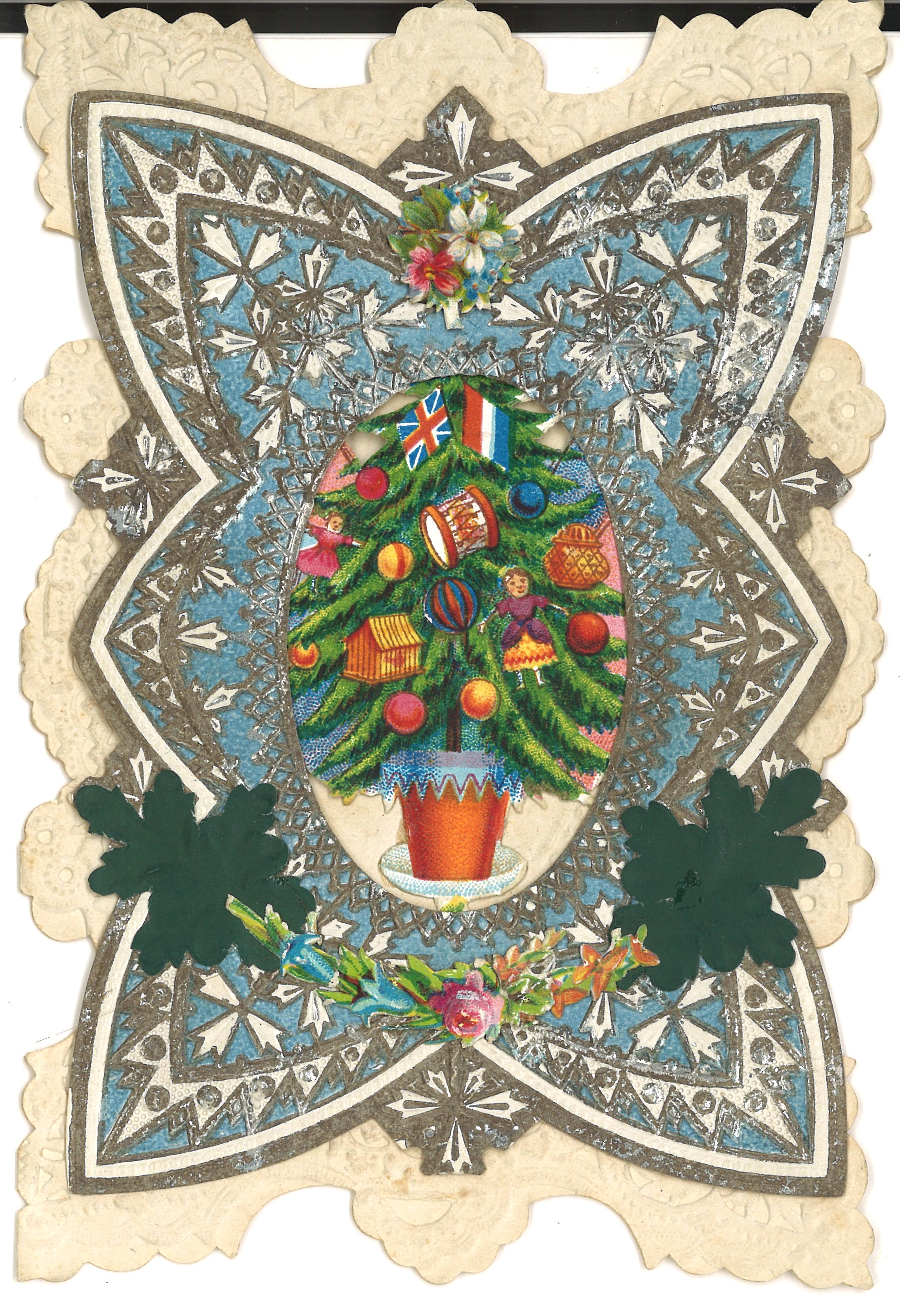 Christmas card constructed of multiple layers of scalloped-edged paper in white, gold, silver, and blue with a Christmas tree in the center and a floral garland beneath it. Printed verse inside "If I Love Thee." Inscribed: Dear Susie from her loving Auntie. Ca. 1890s. For any use other than instructional resources, please check with the organization that owns this item regarding copyright restrictions.