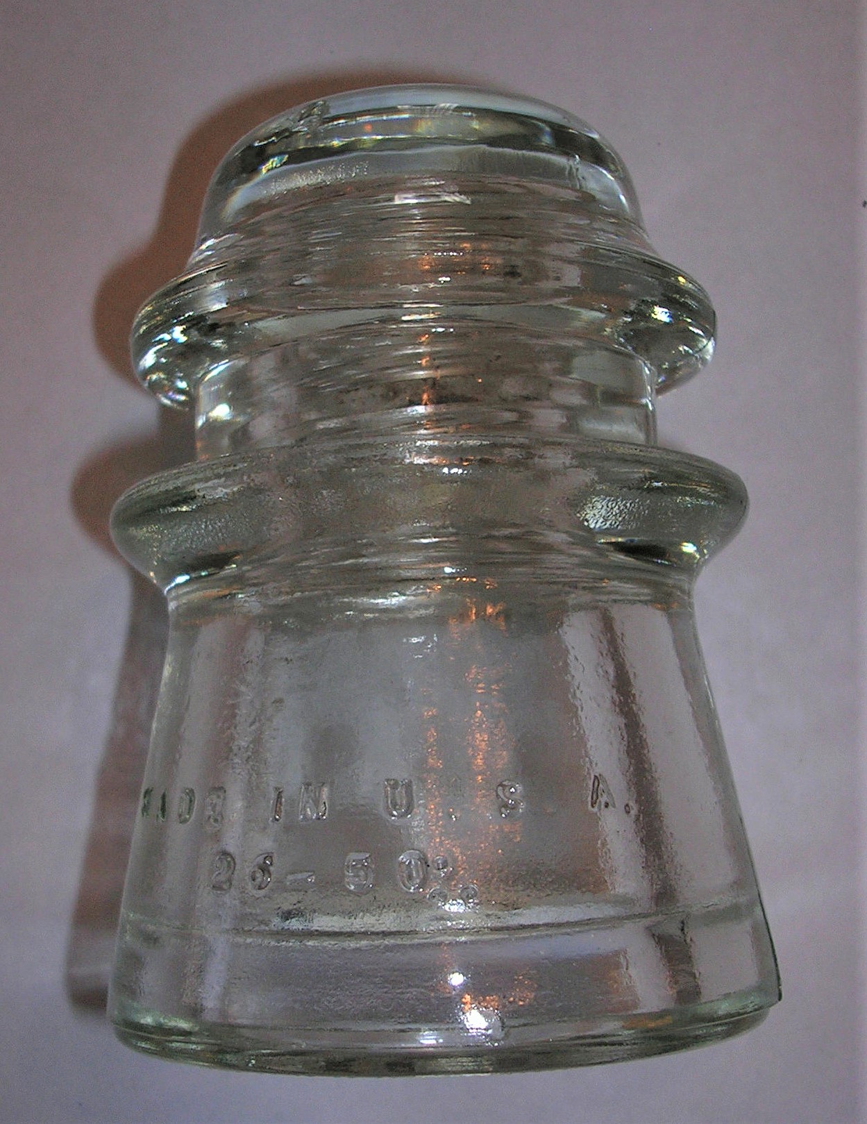HEMINGRAY - 16 & 17 (Mold # 26, 1953) In the early days of the telephone, single petticoat insulators were standard for toll line construction. The Hemingray No. 16, with a single petticoat is still widely used for lines of medium length. The No. 16 has about the longest leakage path possible for a single petticoat type on a standard pin. It has a square wire groove. The No. 17 is exactly similar to the No. 16 except it has a somewhat wider groove for larger wire. Hemingray was founded by Robert Hemingray and Ralph Gray in 1848 and had factories in Cincinnati and Covington, Kentucky along with its main factory in Muncie, Indiana built in 1870. Along with insulators, Hemingray produced other glass ware products for industrial use. In 1933, the company was purchased by the Owens-Illinois Glass Company, which continued to produce the Hemingray products under the Hemingray brand. Telegraphs were first introduced to Iowa in 1848 with a line connecting Dubuque, Keokuk, Burlington, Bloomington (Muscatine), Iowa City, and Davenport, Iowa to Peru, Illinois. By 1861, two telegraph companies were responsible for the Iowa lines, Western Union Telegraph Company and the Illinois & Mississippi Telegraph Company. Western Union Telegraph was also responsible for the earliest telephone lines introduced to Iowa with the first exchange being built in Keokuk, Iowa in 1878 along with exchanges in Des Moines, Davenport, and Ottumwa. Western Union would sell to the Bell Company in 1879 and Bell would construct its first exchange in Dubuque in the same year. Bell Company would establish several smaller companies to aid in the management of the Telephone lines including Hawkeye Telephone, Iowa Union Telephone, and Iowa & Minnesota Telephone. Hawkeye Telephone established the telecommunications in Cedar Falls and Waterloo Iowa in 1881. For any use other than instructional resources, please check with the organization that owns this item regarding copyright restrictions.