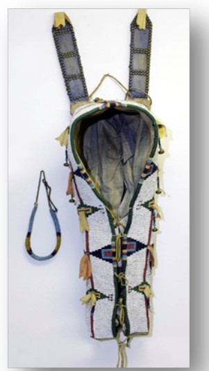 Cradleboards like this one were used by many indigenous cultures in North America. The cradleboards allowed Native American women to take their children with them when they traveled and worked. Content can be used with the following standard: 1st grade SS 1.23 Cultural Makeup in a lesson on Native American culture and daily life in Iowa. For any use other than instructional resources, please check with the organization that owns this item regarding copyright restrictions.
