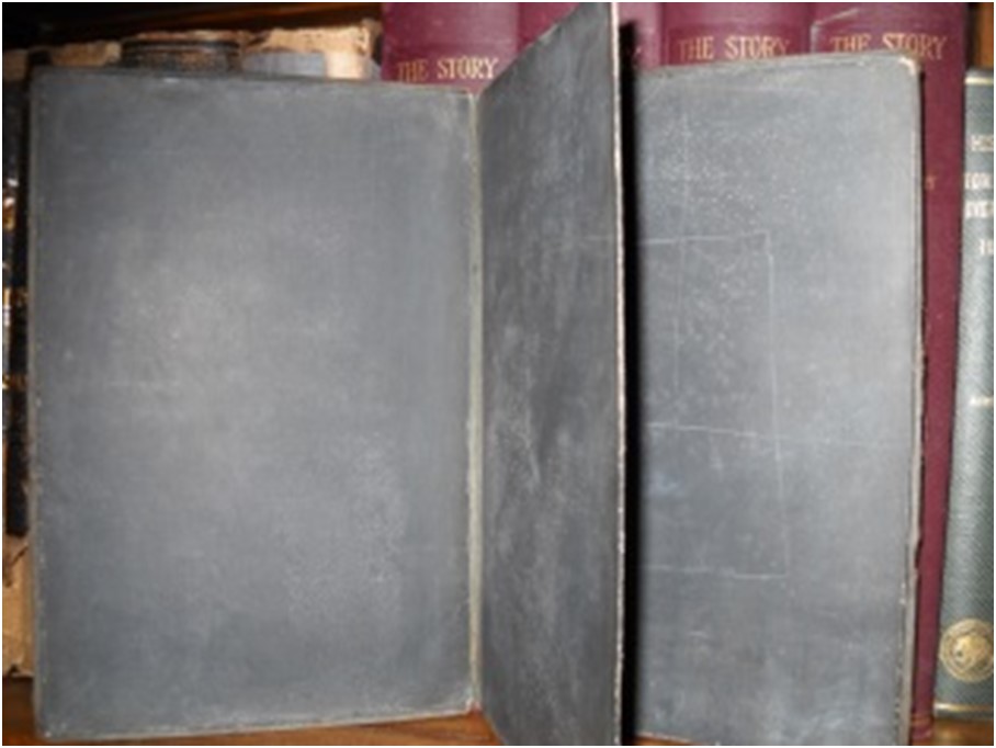 During the late 1800s, writing slates like this one were used in schoolhouses in Iowa and around the world. The slates were typically placed inside a wooden frame; however, they could also be bound together in a "slate book," as this one is. Students used a pencil made of slate, which is a type of rock, to write on the slates. The slates were also easy to clean using a cloth or sponge. By the 1930s, materials such as paper began replacing slates as the primary writing material used in schools. Content can be used with the following standards: 3rd grade SS 3.28 Cultural Contributions in a lesson on Iowan schools during the late 1800s. For any use other than instructional resources, please check with the organization that owns this item regarding copyright restrictions.