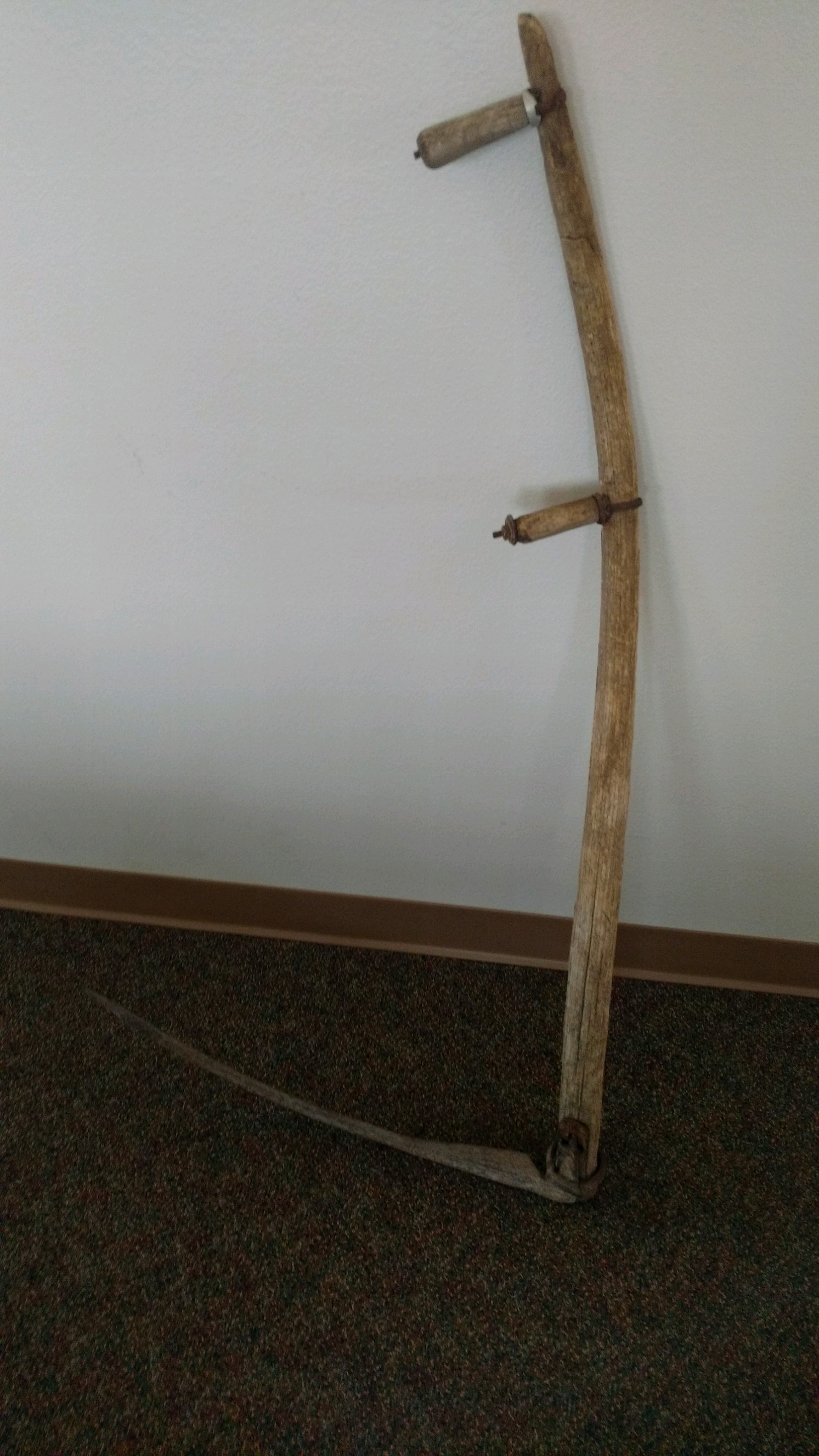 This scythe was used by one of the early settlers of O'Brien County, Iowa. Scythes were commonly used to mow grass or harvest crops before the invention and growing popularity of horse-drawn machinery and tractors. Content can be used with the following standards: 4th grade SS 4.26 Changes to Agriculture in a lesson on inventions and improvements on said inventions, that benefit farming and crop production. For any use other than instructional resources, please check with the organization that owns this item regarding copyright restrictions.