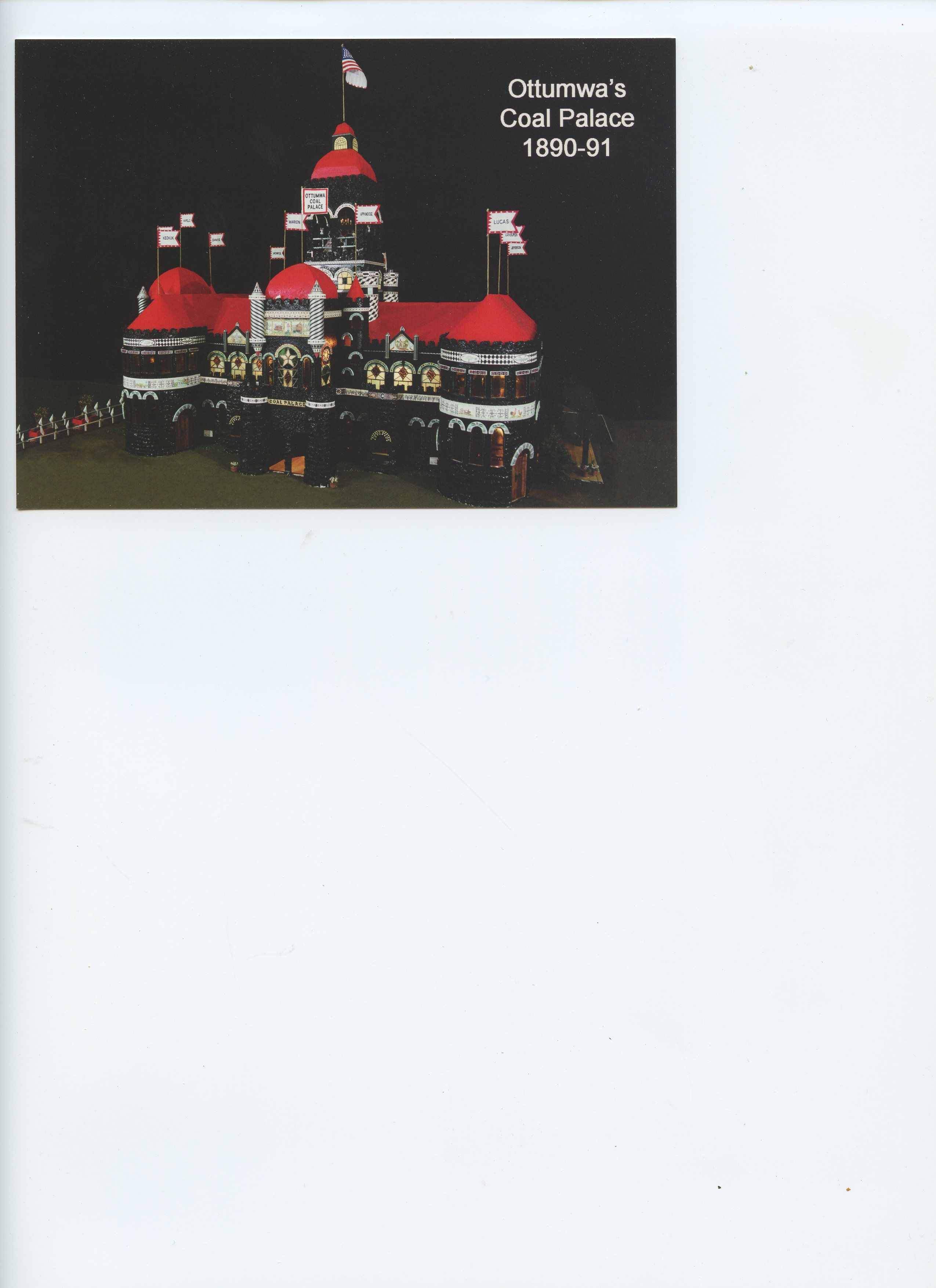 The Ottumwa Coal Palace was a part of a trend in the 1890's during which communities built large elaborate palaces to showcase the products that were available within the area. The Ottumwa Coal Palace was built with the help of Peter G. Ballingall and other local entrepreneurs who formed the Ottumwa Coal Palace Association. By May of 1889 they had sold $30,000 worth of premiums to finance the large palace. On September 16, 1890 the doors opened to the Coal Palace. Ottumwa was flooded with spectators from all over the world to see the "diamond" palace glistening in the sun. President Benjamin Harrison brought an entourage of dignitaries to see this national monument.The palace had a bright red roof and had a design of seeds, grain, flowers, coal and wood that were native to the area. The palace also had many multi-colored stained glass windows.The size of the building was nearly the size of a city block- 230 feet long and 130 feet wide. It was 200 feet up to the top of the center tower.The exhibition was closed on October 11, 1890 and another exhibition was held the fall of 1891. However after the fall of 1891 the coal palace was torn down and the salvage was sold for $3,000. The Wapello County Historical Society Museum now holds a replica that was made by Milly Morris. The replica was built in June of 1997, with the help of 30 volunteers and about 3,000 hours of building. The replica is estimated to be over 90% authentic to the real Coal Palace. The replica is approximately 8 feet long and over 3 feet wide and five feet in height. For any use other than instructional resources, please check with the organization that owns this item regarding copyright restrictions.